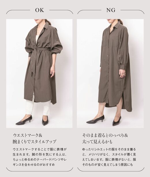 写真のワンピースは、1枚でそのまま着ることもできますが、ウエストマークしてシワを作り、動きを出してみました。袖もたくし上げて手首を見せ、たるませることでより表情をつけています。比べるとよくわかりますが、シワを出して着たほうがスタイルよく、素敵に見えませんか?