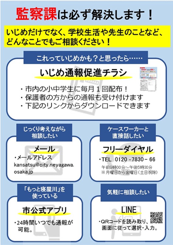 「監察課は必ず解決します! いじめだけでなく、学校生活や先生のことなど、どんなことでもご相談ください!」――大阪府寝屋川市危機管理部監察課のウェブページにアクセスすると、このような力強い文言が目に飛び込んでくる。