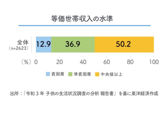 まず、この調査の報告書では、等価世帯収入(各収入の選択肢の年間収入の中央値をその世帯の収入とし、同居家族人数の平方根で調整したもの)の水準が、「中央値の2分の1未満に該当する」貧困の問題を抱えている世帯を「貧困層」、「中央値の2分の1以上で中央値未満」に該当する貧困の課題を抱えるリスクの高い世帯を「準貧困層」と捉え、分析を行っている。