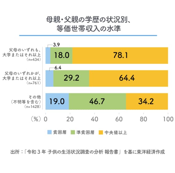 保護者の学歴による違いについては、母親、父親ともに学歴が高いほど「貧困層」に該当する割合が低い。「父母のいずれも、大学またはそれ以上」の学歴の場合、「貧困層」の割合は3.9%、「父母のいずれかが、大学またはそれ以上」だと6.4%、「その他(不明等を含む)」の場合は19.0%となっている。