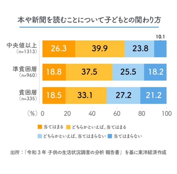 例えば「お子さんに本や新聞を読むように勧めているか」という設問に対して、「どちらかといえば、当てはまらない」「当てはまらない」と回答した割合を合計すると、等価世帯収入が「中央値以上」の世帯では33.9%だが、「貧困層」では48.4%と10ポイント以上高くなっている。同じ割合は、「ひとり親世帯」全体でも46.8%、「母子世帯」でも45.2%と高い。