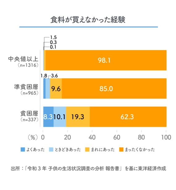 では、実際にどんな苦しさがあるのか。これについては「過去1年間に必要とする食料が買えなかった経験があったか」という設問があり、「よくあった」「ときどきあった」「まれにあった」という回答を合わせた割合は、「準貧困層」で15.0%、「貧困層」では37.7%となっている。