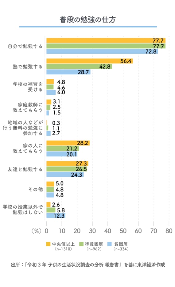 学習の状況については、「普段学校の授業以外で、どのように勉強しているか」という設問を子どもに聞いている。それに対して「塾で勉強する」という回答は全体では47.2%、「家の人に教えてもらう」が24.4%だったが、「貧困層」ではそれぞれ28.7%、20.1%で、ほかの世帯より低い割合になっている。逆に「学校の授業以外では勉強はしない」という割合は全体では4.9%だが、「貧困層」では12.3%とほかの世帯より高くなっている。
