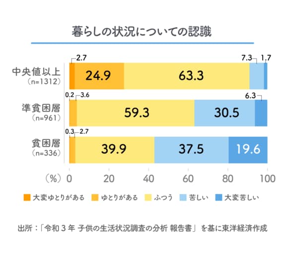 暮らしの状況に関しては、全体としては「苦しい」が19.7%、「大変苦しい」が5.6%だが、「貧困層」の世帯に限ると「苦しい」と「大変苦しい」を合わせた割合が57.1%にも及んでいる。また世帯の状況別に見ると、「苦しい」と「大変苦しい」を合わせた割合は、「ふたり親世帯」だと21.5%だが、「ひとり親世帯」全体では51.8%、「母子世帯」だけで見ると53.3%になっている。