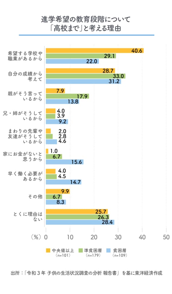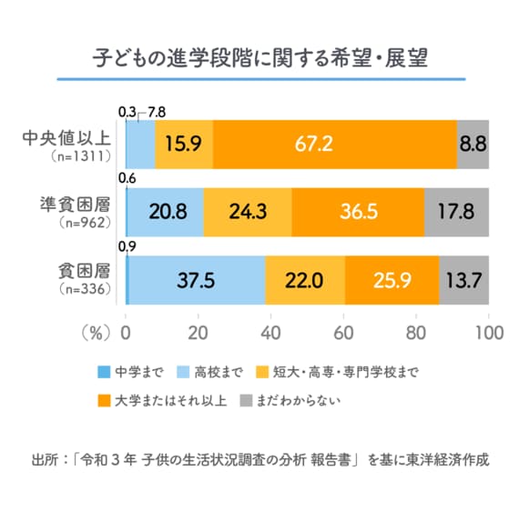 進学希望を聞いた設問では「高校まで」と答えた子どもにその理由も尋ねている。全体では「家にお金がないと思うから」が7.8%、「早く働く必要があるから」が7.3%だが、「貧困層」ではそれぞれ15.6%、14.7%と2倍近くになっている。経済的な状況が、明らかに機会の平等を阻害している現実が浮かび上がってくる。