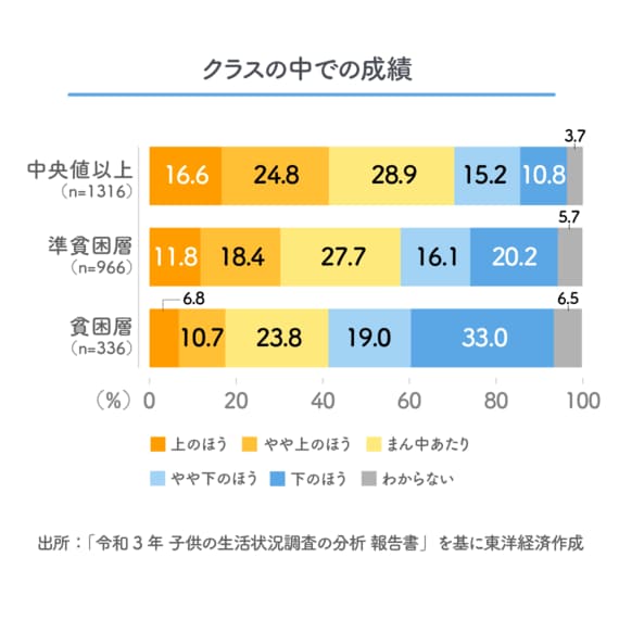 また、「クラスでの成績」については、「やや下のほう」と「下のほう」という回答の割合を足すと、等価世帯別収入が「中央値以上」の世帯では26.0%だが、「準貧困層」では36.3%、「貧困層」では52.0%となっている。これはあくまでも子どもが自分の成績をどう思っているかを尋ねたものだが、収入が少ない世帯ほど学業成績がよくないというのが現実なのだろう。