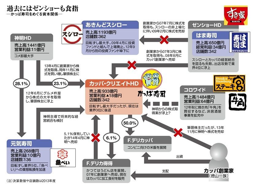 そうした中で浮上したのが、元気寿司の筆頭株主で卸側からすし再編の絵を描いた神明との提携だ。昨年4月には徳山一族が保有するカッパ株を神明に売却。同年11月には神明がカッパ株を買い増し、元気との経営統合を前提にした再編案をブチ上げた。