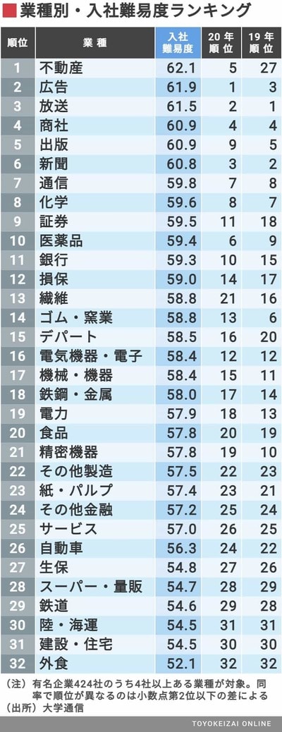 不動産の人気の要因について清水社長は、「街づくりや土地開発事業などを手掛けることから人気が高い業種。早慶上智やMARCH(明治大、青山学院大学、立教大学、中央大学、法政大学)など、平均難易度が高い首都圏の私立大からの入社が多いので、連動して入社難易度も高くなる」と、話す。個別の企業を見ると、8位三菱地所、13位三井不動産、17位東急不動産、21位東京建物などがランキング上位に入っている。
