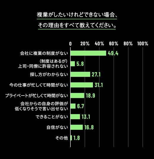 一方で、『The 3rd Door』の調査では、複業できない理由の約50%は、会社側に制度がないというものだった。