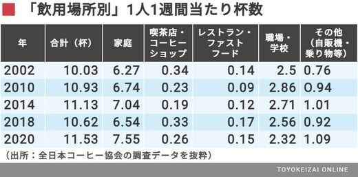 全日本コーヒー協会が長年発表する「コーヒーを飲む場所」別調査では、昔から「家庭での飲用杯数」が圧倒的だったが、最新の2020年は過去最多数値となっている。