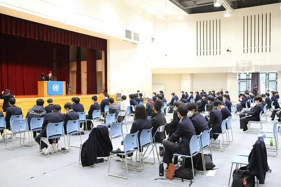 授業のゴールは、年度末に英語で行う「国連総会」だ。それに向け、生徒たちはこの1年間、さまざまな活動に取り組んできた。