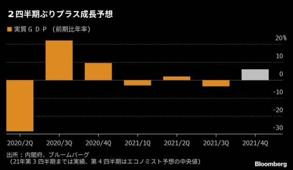 もっとも、GDP成長率は1-3月期に鈍化し、再びマイナスに陥るとの見方も出ている。コロナ感染再拡大で政府は1月9日にまん延防等重点措置を沖縄など3県に発令。対象地域はその後、東京都を含む36都道府県に広がった。