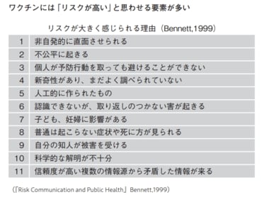 リスクコミュニケーションの教科書にも載っていることなんですが、人はこのような要素があると、実際よりもリスクを大きく見積もってしまう傾向があるんです。まさにワクチンに当てはまりますね。