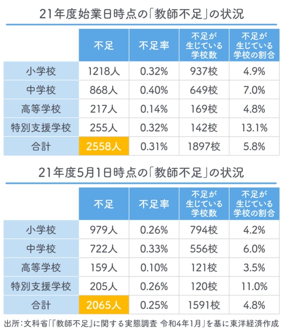 不足率は0.31%であり、そう聞くと大したことがないように思えるかもしれないが、これは分母の教員総数と比べた率だからであり、事態は楽観視できない。5月時点では多少マシになったものの、不足は合計2065人であった。学校数で見ると、およそ20校に1校で教員不足が起きている。
