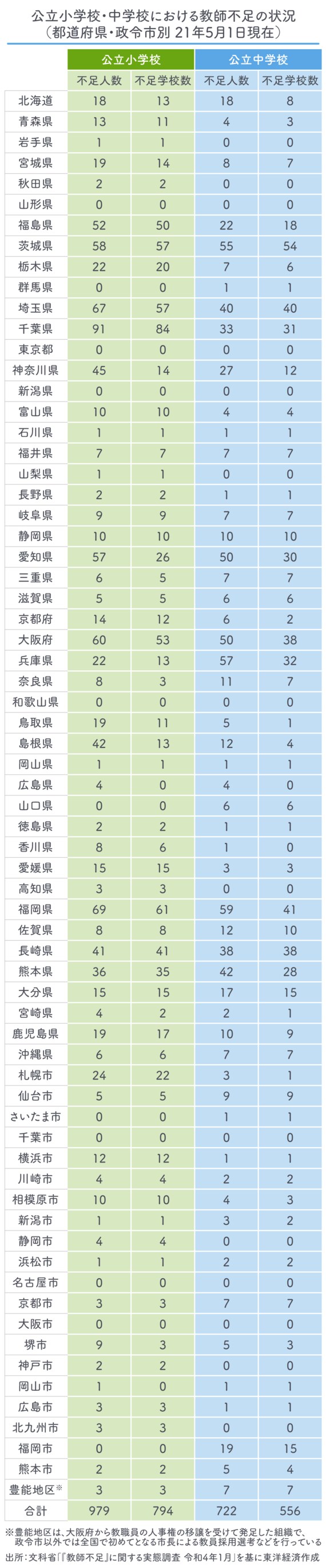 当然のことながら、年度当初から学級担任が配置できない、教科の先生がおらず授業がスタートできないといった事態は避ける必要がある。だから、今回のデータは、各地必死になって探した結果と見たほうがよいだろう。それでもなお不足しているということである。