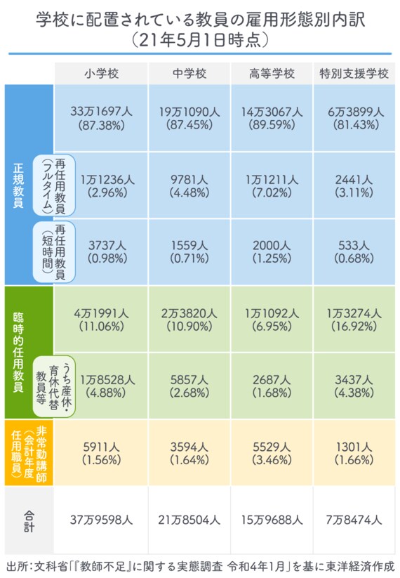 今回の文科省調査では、学校に配置されている教員の雇用形態の内訳も公表されている。地域差のある話だが、全国のデータしか公表されていないので、そこを参照すると、小学校、中学校では1割強が非正規教員である。うち、臨時的任用教員というのは、常勤講師とも呼ばれる職で、基本的な仕事内容は正規教員と大差ない。