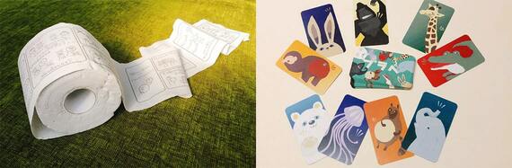 ソウレッジが販売する子ども向け性教育トイレットペーパー(左)。カードゲーム「プラべ」ではプライベートゾーンについて学べる(右)