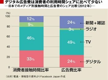 広告業界の最近の傾向としても、デジタルメディア、特にモバイルがらみの売り上げが年々増えています。とはいえ、日本の2013年の総広告費6兆円のうち、デジタルメディアが占めていたのは9400億円で、モバイル広告に至ってはわずか2200億円にすぎません。