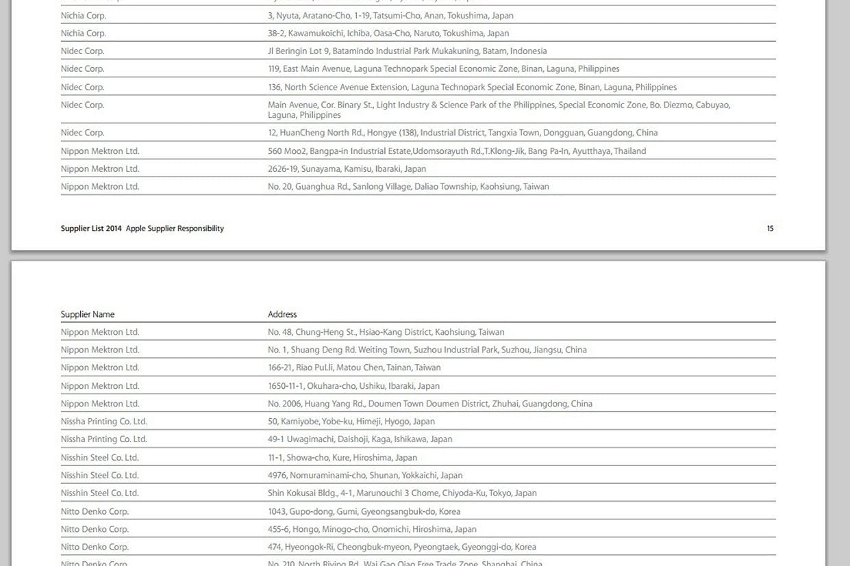 アップルが毎年更新しているサプライヤーリスト。NOKの子会社である日本メクトロンも、「Nippon Mektron Ltd.」(画像中央)として掲載されている