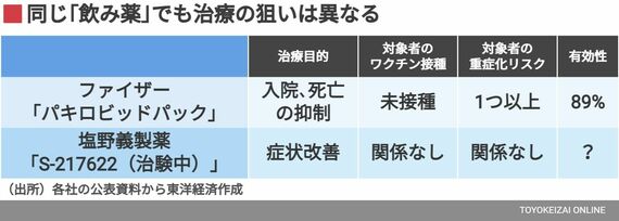 だが、同じ飲み薬でも、海外メーカーと塩野義のものでは、対象者や治療の目的は大きく違うものとなりそうだ。
