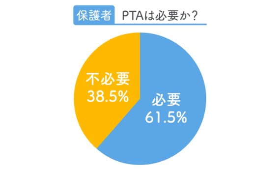 まずは保護者の認識から見ていこう。PTAの必要性についての設問では「必要に思う」が61.5%と、「不必要に思う」の38.5%を大きく上回っている。