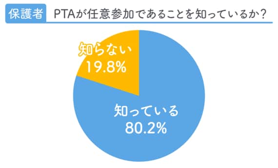 以上から見えてくるのは、PTAでは今の時代に即した運用が行われていない点と、任意と言いつつも参加が半ば強制されている点だ。PTAが任意参加という事実を知っているかどうかを聞いた設問では19.8%と、約2割の保護者が「任意であることを知らなかった」と回答している。