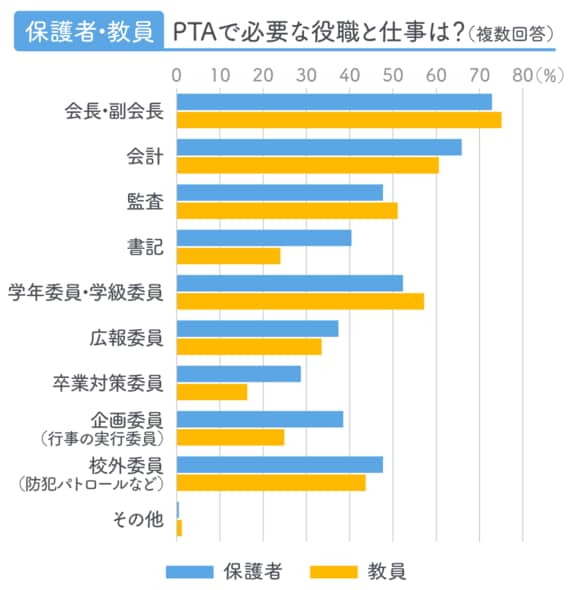 ちなみに、PTAを「必要」とした回答者に必要な役職と仕事を聞いたところ、以下の結果となった。「会長・副会長」が最も多い72.9%、次いで「会計」が65.9%。最も少なかったのが「卒業対策委員」の28.7%であった。これは教員にも同じ質問をしているが、同じような傾向が見られた。異なる点としては、保護者には重要視されている「書記」が、教員からはあまり必要とされていない結果になっている。