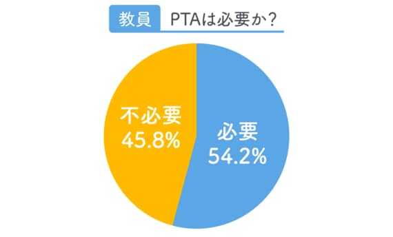 そのうえでPTAの是非を聞いた設問を見ると「必要に思う」が54.2%、「不必要に思う」が45.8%と保護者よりも肯定的な意見が少なく、是非はほぼ半々の回答であった。