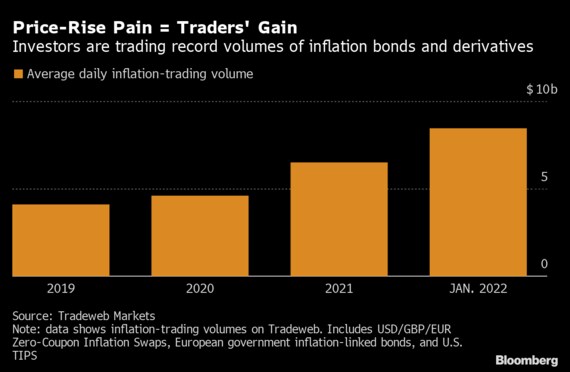 事情に詳しい関係者によれば、モルガン・チェースではノンリニア・レート世界責任者ギル・ホームズ氏が昨年、インフレトレードで約3億ドルの収入創出に寄与し、バークレイズやモルガン・スタンレーのトレーダーもこの分野で稼いだ。バリ・アナリティクスのデータによると、ウォール街の主要銀行全体では21年に約23億ドルと、19年の2倍余りに達した。他の債券取引が低迷する中で歓迎される傾向だ。