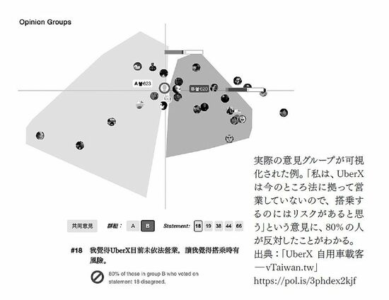 〈vTaiwan〉では、意見に対して賛成か反対かを表明するボタンを押すと、同じ意見の人がいる場所にあなたのアイコンが位置づけられます。こうしてさまざまな意見が分類され、可視化されるのです。