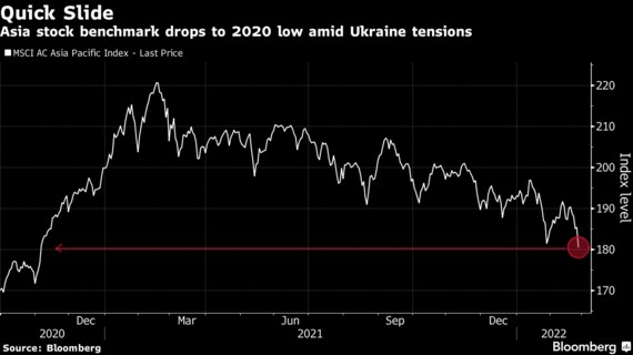原題:Asia Stocks Tumble Most in a Year as Russia Attacks Ukraine、India Sensex Sinks 5% as Global Selloff Extends on Ukraine Risk(抜粋)
