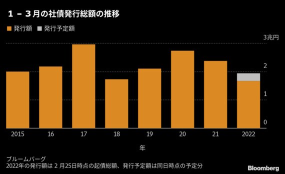 国内では25日時点で、3月末までに総額2730億円程度の円建て社債が起債予定。ブルームバーグのデータによると、22年はこれまでに総額1兆6925億円の社債が条件決定した。今後も起債延期の動きが続けば、1-3月期としては18年以来4年ぶりに2兆円を下回る可能性も出てくる。