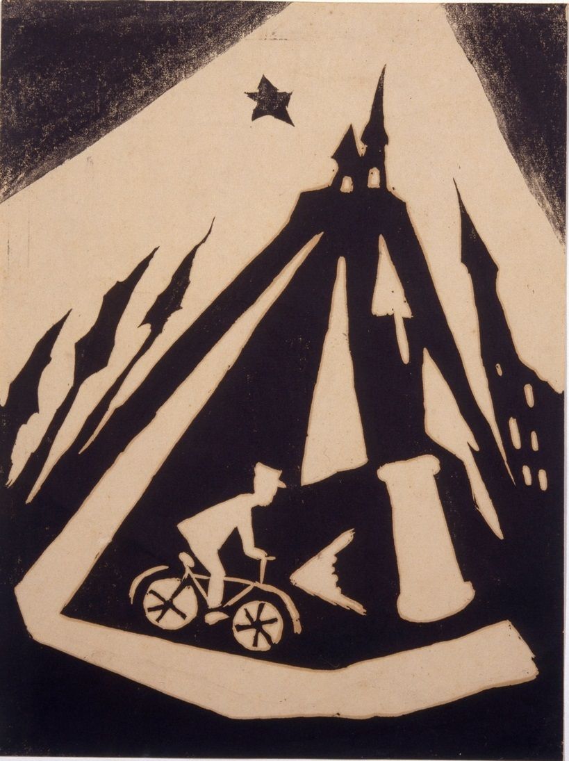 星空の下、制服、制帽の男がライトをつけて自転車をこいでいく。黒い影が不穏な雰囲気を醸し出す。この作品は『カリガリ博士』や『プラーグの大学生』など、ドイツ表現主義の映画の影響を受けていると滝沢さんは見る。表現主義とは、外見を表現する印象派に対して、不安などの感情を表そうとするものだ。