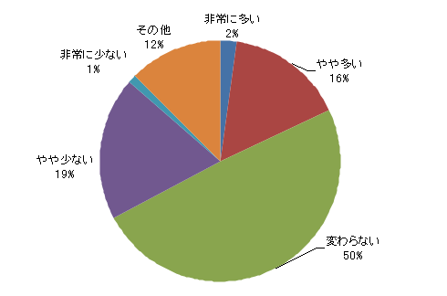 一方、「増加する」と「減少する」の回答を見ると、今年は「増加する」との回答が「減少する」との回答を上回った。「2割以上増加」と予想する企業が7%もある。今後の円高の行方など、経済環境によって変わっていくこともありうるが、現時点では学生にとって少し明るい兆しといえよう。