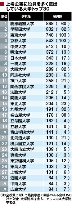 2位は、早稲田大学。早稲田と慶応は、言わずと知れた私立大学の両雄。在籍数は早稲田が約5万3000人に対して、慶応は3万3000人弱。圧倒的に早稲田のほうが多いが、上場企業の役員数でいえば慶応の後塵を拝している。