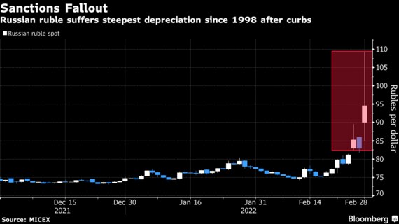 ロシア中央銀行のナビウリナ総裁は2月28日、西側諸国の同中銀に対する制裁措置が意味するところを初めて認めた。通貨ルーブルの急落を阻止するための市場介入ができないということだ。