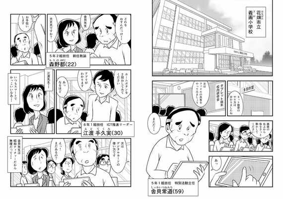 学級経営の腕は確かだがICT機器を扱うのは苦手なベテラン教員を中心に、“紙と鉛筆”派の教員、失敗を恐れずICTを活用した授業に挑戦する新任教員、ICTの知識に長けた指導教員、生徒指導主任など、さまざまな人物が登場する。GIGAスクール構想に戸惑いながらも、端末を生かして子どもたちの創造性を引き出し協働学習を進めていく様子、教職員一人ひとりが、端末を使うことによる課題や問題意識と向き合いながらも自らが学びを深めていく様子などが、漫画と、わかりやすくかつ示唆に富んだ文章で構成されている。