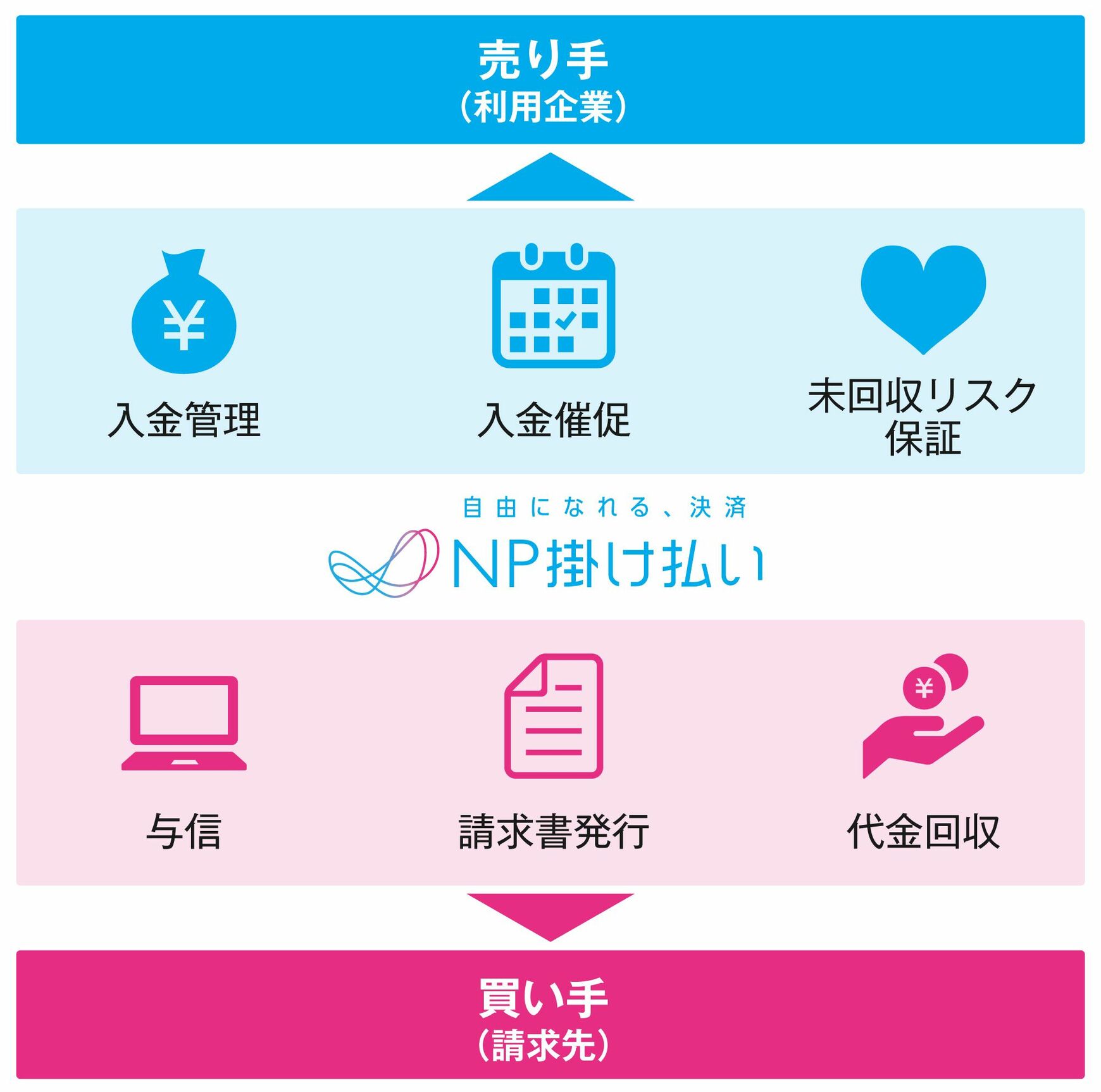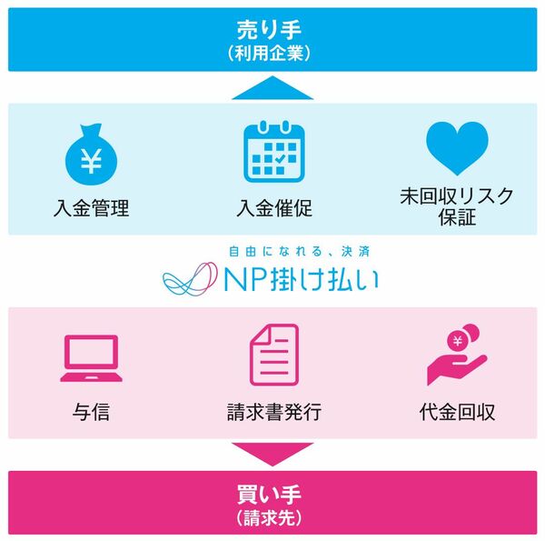 設立したての企業でも、「NP掛け払い」が間に入ることで、売り手企業に入金の約束ができるので、既存の与信基準では新規取引が難しかった大手企業との取引が可能になったり、請求に対して、銀行振込、口座引き落とし、コンビニ払いと選択肢が広がったりする。さらにコンビニ払いでは手数料が不要なので、振込手数料の負担が軽減される。