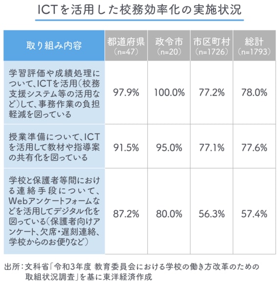 文部科学省が行った調査(「令和3年度 教育委員会における学校の働き方改革のための取組状況調査」)では、学習評価や成績処理について校務支援システムなどのICTを活用して事務作業の負担軽減を図っている自治体は全体で78.0%、都道府県で97.9%、政令市で100%、市町村で77.2%となっている。