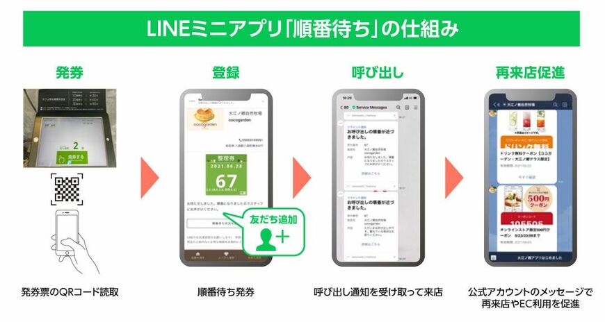 また、店舗側のオペレーションの問題として、順番を間違えて入店順位が入れ違いになりお客様の不満につながってしまう、大きな声で名前を呼ばないといけない、なども挙げられる。こうした店舗とユーザー双方の不便や不満解消につながるのが、LINEミニアプリの「順番待ち」機能というわけだ。