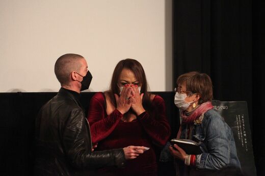 この日の舞台あいさつでは、牛久の元被収容者3人もマイクを握った。トルコのクルド人デニズさん、アフリカ系のピーターさん、セクシャルマイノリティのナオミさん。いずれもファーストネームを公表して作品に登場した人たちだ。現在は仮放免中である。