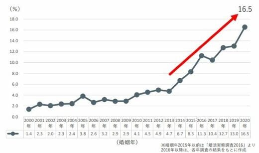 次に、婚活サービスを通じて結婚した人の割合を見ると、2020年では婚姻者の16.5%、およそ6人に1人が婚活サービスを通じて結婚している結果となり、1.4%だった2000年と比べると、大きく伸長しています。