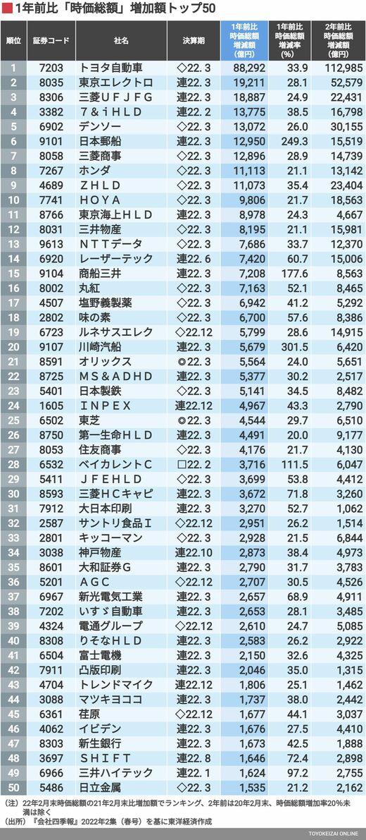 政治・経済・投資 時価総額が1年前比で急増した50社ランキング コロナ禍で市場の評価を高めた企業はどこか 4分で読める 公開日時:2022/03/20 07:30 山内 哲夫 東洋経済 記者 フォロー 1/3 PAGES 2/3 PAGES 3/3 PAGES (本記事は会社四季報オンラインにも掲載しています)