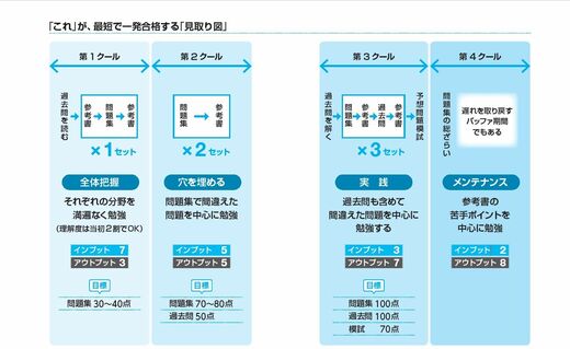 全体スケジュールで大切になるのは、第3クールが終わるまでに合格最低点がとれるようになること。これが実現できれば、合格はもう目の前。第4クールをバッファとして使え、気持ちの余裕も生まれますし、仕上げの勉強もできるからです。