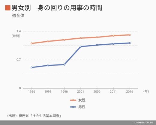 ところで、清潔意識について考えるとき、世の中の実態がほんとうに清潔になっているかを把握してみたい。そこで使用したいのは総務省統計局の社会生活基本調査だ。この調査は国民の生活実態を調査したもので、そのなかに興味深い「身の回りの用事」にどれだけ時間を使ったかを質問している項目がある。