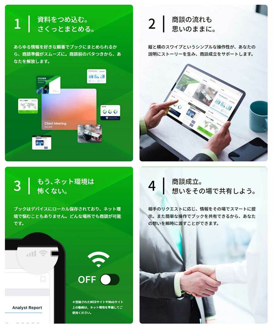 「情報を見せる際、それぞれのアプリに切り替えずHandbook Xの中で閲覧できるので、たくさんの情報をスムーズにストーリー立てて見せることができるでしょう。商談の決め手はひとつではありません。さまざま資料や情報の積み重ねで成立するものです。多様な情報を使いこなす営業パーソンの味方になるのではないでしょうか」