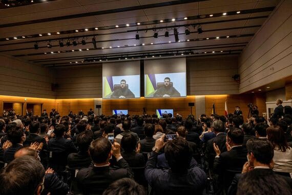 ゼレンスキ―氏は、日本の援助に謝意を表明した上で、ロシアとの貿易禁止を求めた。国連安全保障理事会が機能していないとも指摘し、日本の指導者に積極的な役割を果たすよう要請した。アジアで初めてロシアに強い圧力をかけた点も評価した。