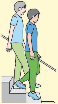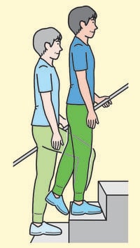 ※前側の足で階段を踏みしめるようにゆっくりと上る。後ろ側の脚では階段を蹴らない