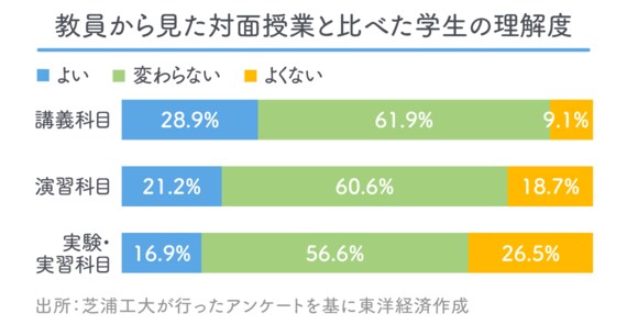 前期授業が終了した段階で学生にアンケート調査を行ったところ、約80%の学生がオンライン授業に満足と回答している。教員へのアンケートでも、対面授業と比べた場合の学生の理解度は「よい」「変わらない」が講義科目では9割超、演習科目でも8割超だった。一方、実験・実習科目では、ほかに比べて「理解度がよくない」という回答が26.5%と高めの結果となった。
