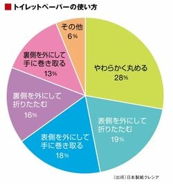 同社のアンケート調査によると、トイレットペーパーの使い方は実にさまざまだ。最も多いのは「やわらかく丸める」(28%)。続いて「表側を外にして折りたたむ」(19%)、「表側を外にして手に巻き取る」(18%)、「裏側を外にして折りたたむ」(16%)、「裏側を外にして巻き取る」(13%)。